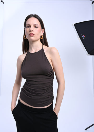 Brown top with halter neck tied at the back, open back, and gathered detailing at the sides.
